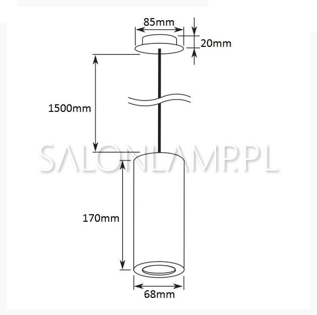 Typowa tuba wisząca występująca w dwóch kolorach czarny i biało-czarny, na żarówkę halogenową lub zamiennik LED. Nie wymaga zasilacza, działa przy napięciu 230V. Oprawa bez możliwości kierowania źródła światła na boki.