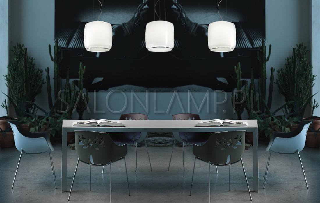 Kolekcja lamp z białego, błyszczącego szkła Murano. Każdą z lamp charakteryzuje staranne wykonanie oraz ozdobny kryształ, wtopiony na brzegu każdej z nich.