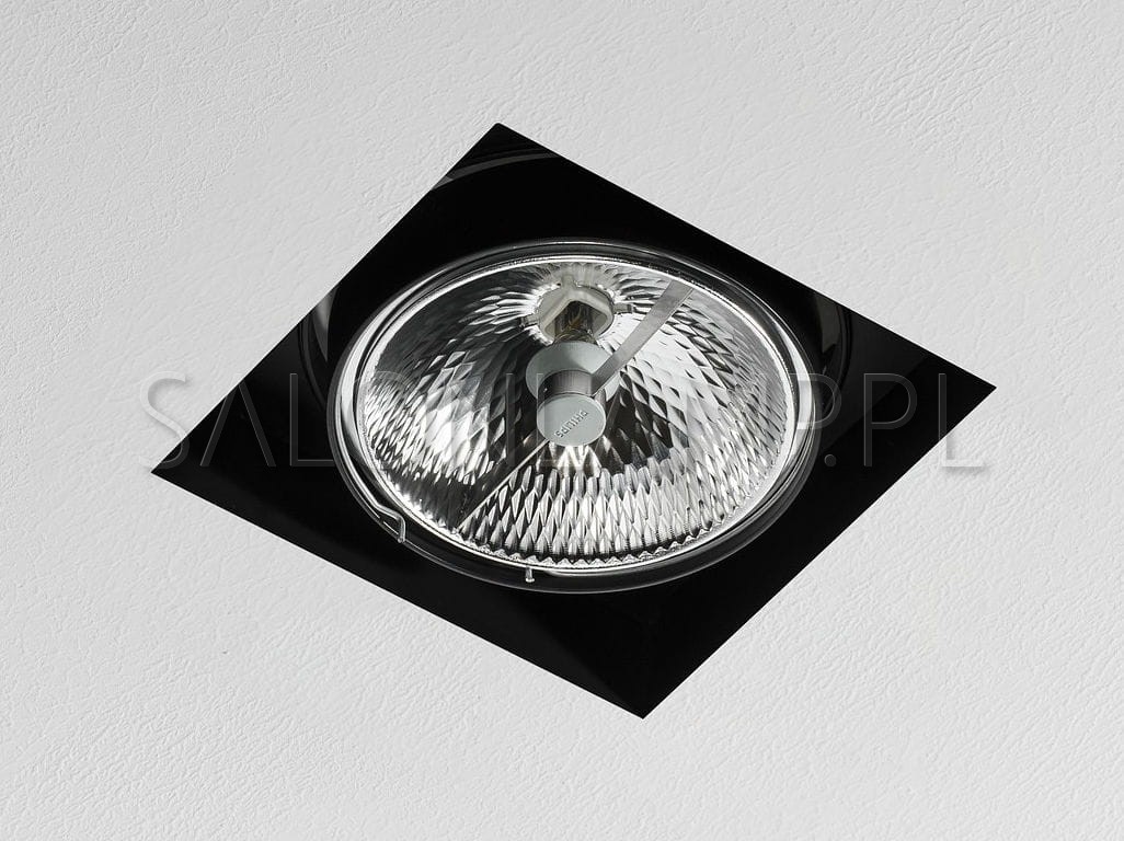 Oprawa wpuszczana kwadratowa, ramka i korpus ze stali. Wymiary - 14 x 14 cm, Moc - max 1x100W. Źródło: halogen QR111 12V. Zasilacz wymagany.