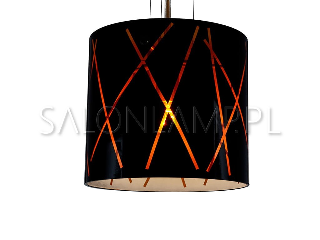 Nowoczesna lampa wisząca. Klosz ze szkła w kolorze czarnym z efektownymi, transparentnymi, pomarańczowymi pasami, wnętrze klosza białe, wymiary 30 x 27 cm.