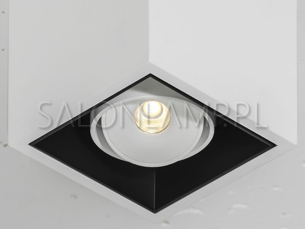 Podstawowa oprawa sufitowa w kształcie kostki w której brak jakichkolwiek widocznych elementów montażowych. Oprawy posiadają blendę przesłaniającą widok do środka oprawy.