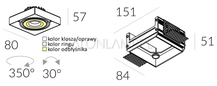 Oprawa wpuszczana kwadratowa, ramka i korpus ze stali. Dostępne kolory alu, biały, czarny, czarno-biały, mieszany. Wymiary - 8 x 5,7 cm, Moc - 1x8,5W, Źródło - Źródło - moduł LED, CRI/Temp. barwowa 830 i 840. Zasilacz w komplecie.