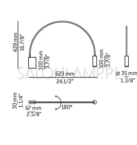 Kinkiet w kolorze czarnym, natomiast cylindryczna aluminiowa główka dostępna w dwóch kolorach: czarnym i złotym.